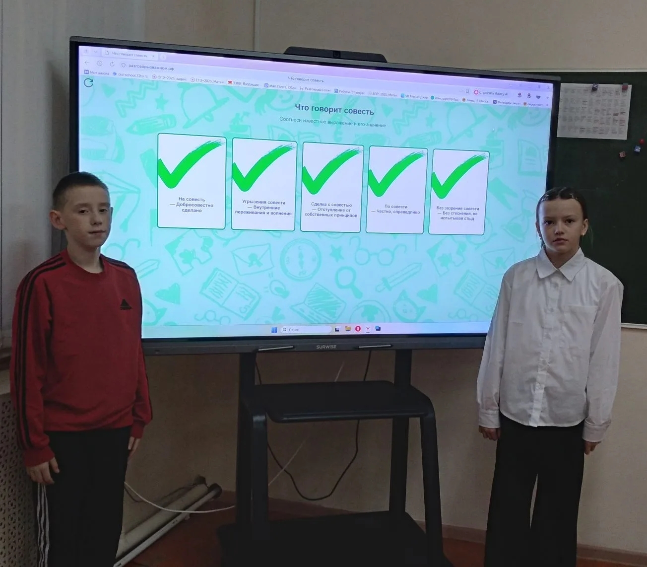 Право поднять флаг предоставлялось лучшим волонтерам школы 2025 года Василине Бородиной и Елизавете Нефагиной. Состоялась передача дежурства и поставлены задачи на последнюю неделю учебной четверти. В школе прошло занятие в рамках федерального проекта «Разговоры о важном». Тема беседы была глубокой и лично значимой для каждого: «Что говорит совесть?» Обучающиеся вместе с учителями размышляли о главных вопросах: Что такое совесть и «внутренний голос»? Как отличить добро от зла в повседневной жизни? Почему так важно прислушиваться к своему нравственному компасу? Как совесть связана с понятиями чести, долга и ответственности? В ходе живого диалога ребята обсуждали, как совесть помогает делать правильный выбор, учиться на своих ошибках и строить гармоничные отношения с окружающими. Такая беседа не просто дает знания — она помогает формировать сильную, нравственную личность, которая сможет внести свой вклад в развитие общества.