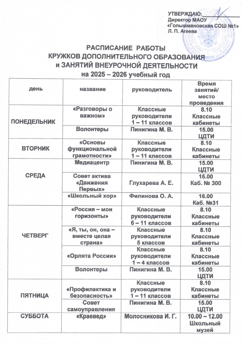 Расписание работы кружков дополнительного образования и занятий внеурочной дейтельности