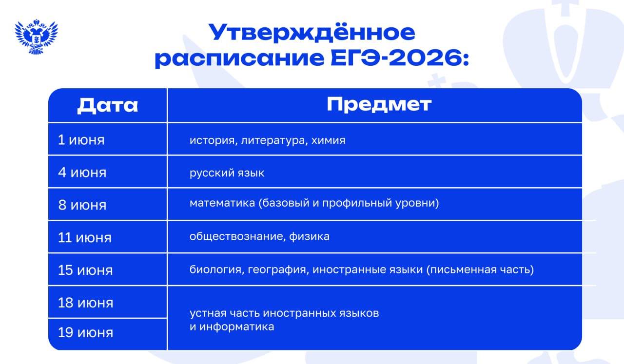 Приказ Министерства просвещения Российской Федерации, Федеральной службы по надзору в сфере образования и науки от 07.11.2025 № 798/1904 "Об утверждении единого расписания и продолжительности проведения единого государственного экзамена по каждому учебному предмету, требований к использованию средств обучения и воспитания при его проведении в 2026 году"