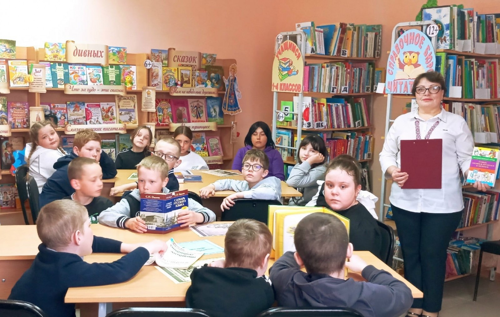 Ребята познакомились со справочными изданиями, имеющимися в библиотеке. Таким изданиям в библиотеке отведено отдельное место, которое называется "Справочное бюро читателя". Библиотекарь рассказала, что в группу справочных изданий входят не только словари, а ещё энциклопедии и справочники, что словари бывают лингвистические и энциклопедические. Участники мероприятия познакомились со знаменитыми толковыми словарями В. Даля и С. Ожегова. Также узнали, что к справочной литературе относятся сборники крылатых слов, афоризмов, изречений, литературных цитат, календари, путеводители. После ознакомления со справочной литературой научились правильно её применять. Для закрепления полученной информации ребята выполнили практические задания, поиграв в игру "Книги, которые знают всё".