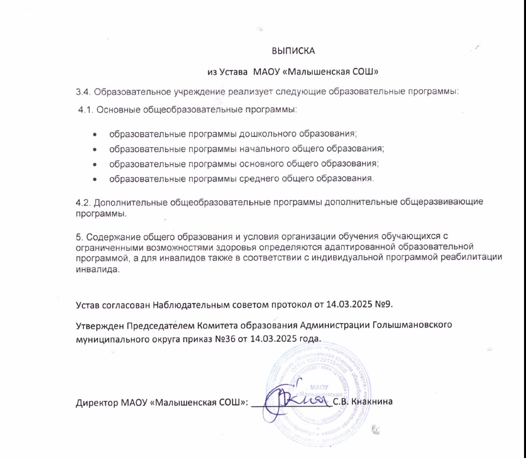 Выписка из Устава МАОУ «Малышенская СОШ»